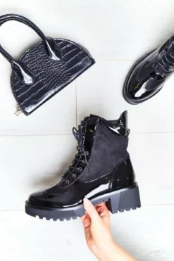 Black Patent Lace Up Zip Ankle Boots -shiri