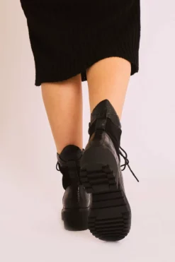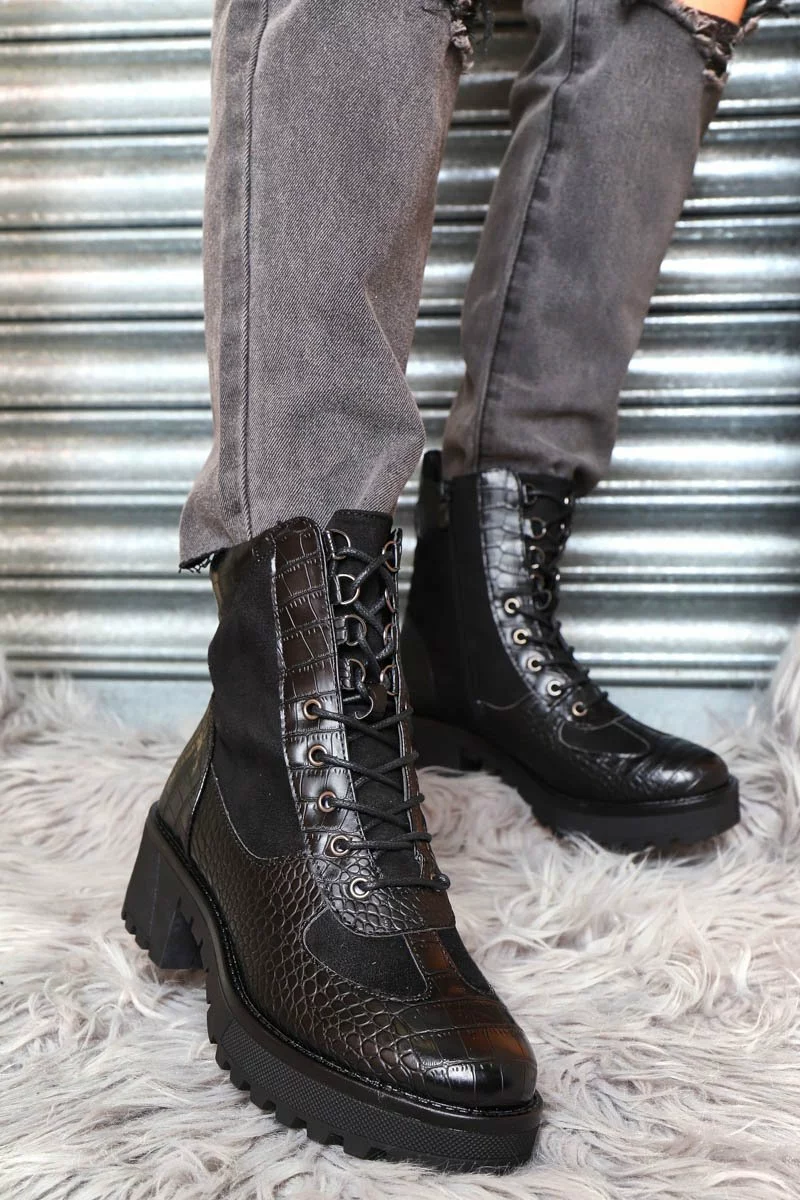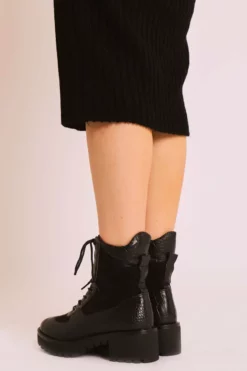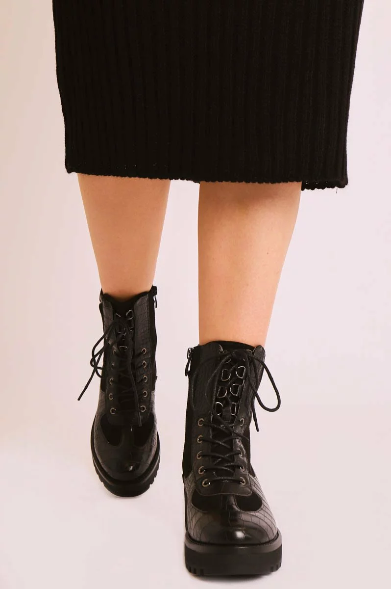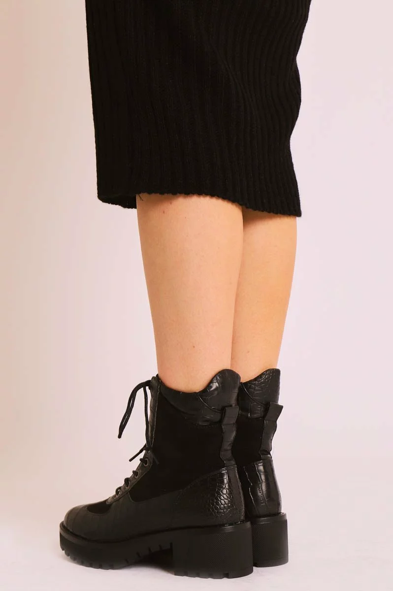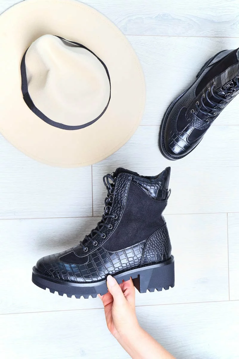 Level up your shoe ‘drobe with our Genevie Black Croc Hiker Style Ankle Boots, featuring black PU detailing, hiker lace up style and chunky heel.