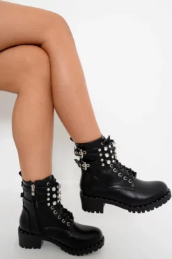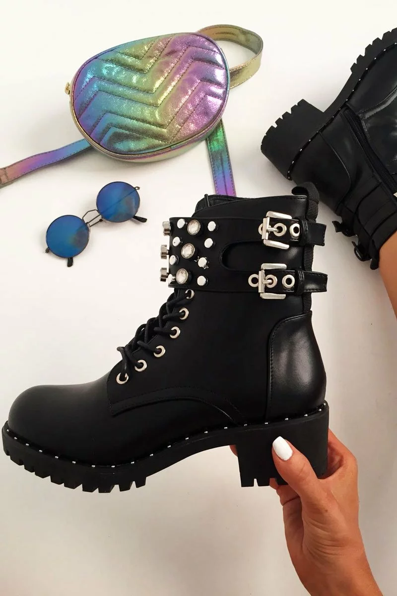 Dare to be bold in our stylish Emonii Black Faux Leather Embellished Ankle Boots! Featuring faux leather material, buckle embellishment and lace up design!