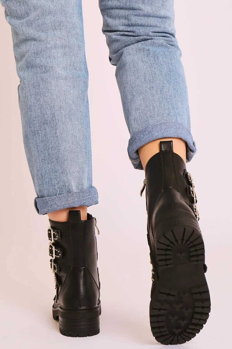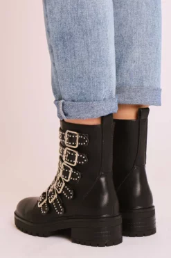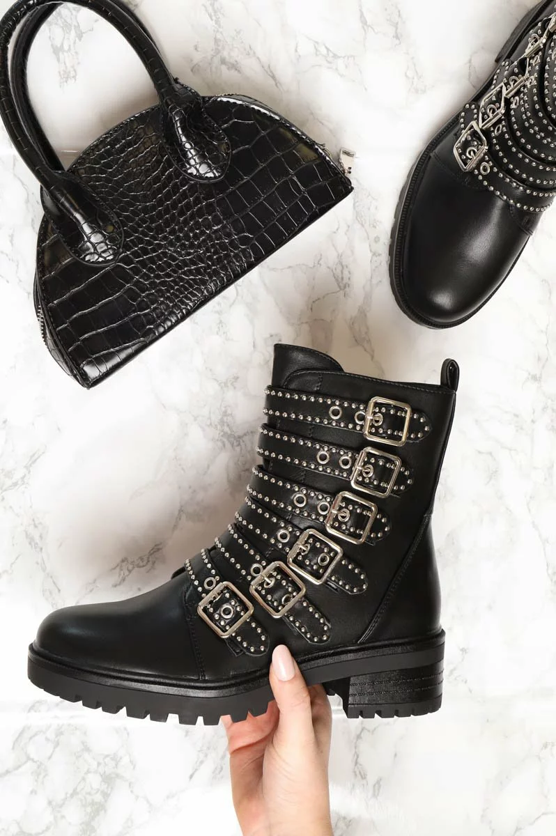 We are OBSESSED with the Lelani Black Faux Leather Stud Buckle Strap Ankle Boots, featuring Faux leather fabric, stud detailing and buckle straps.