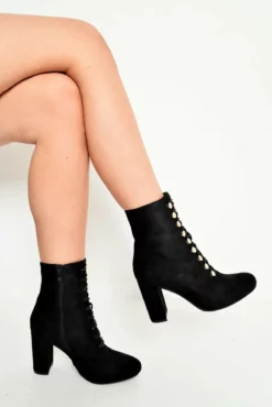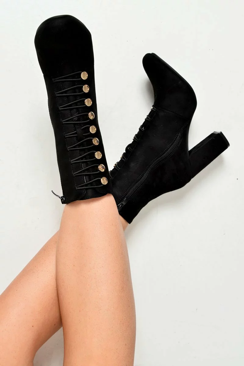 Slay the game in the Hadlyn Black Faux Suede Button Detail Ankle Boots, complete with gold button detailing, zip side and block heel. Pair with jeans and a cute blazer for off-duty vibes.