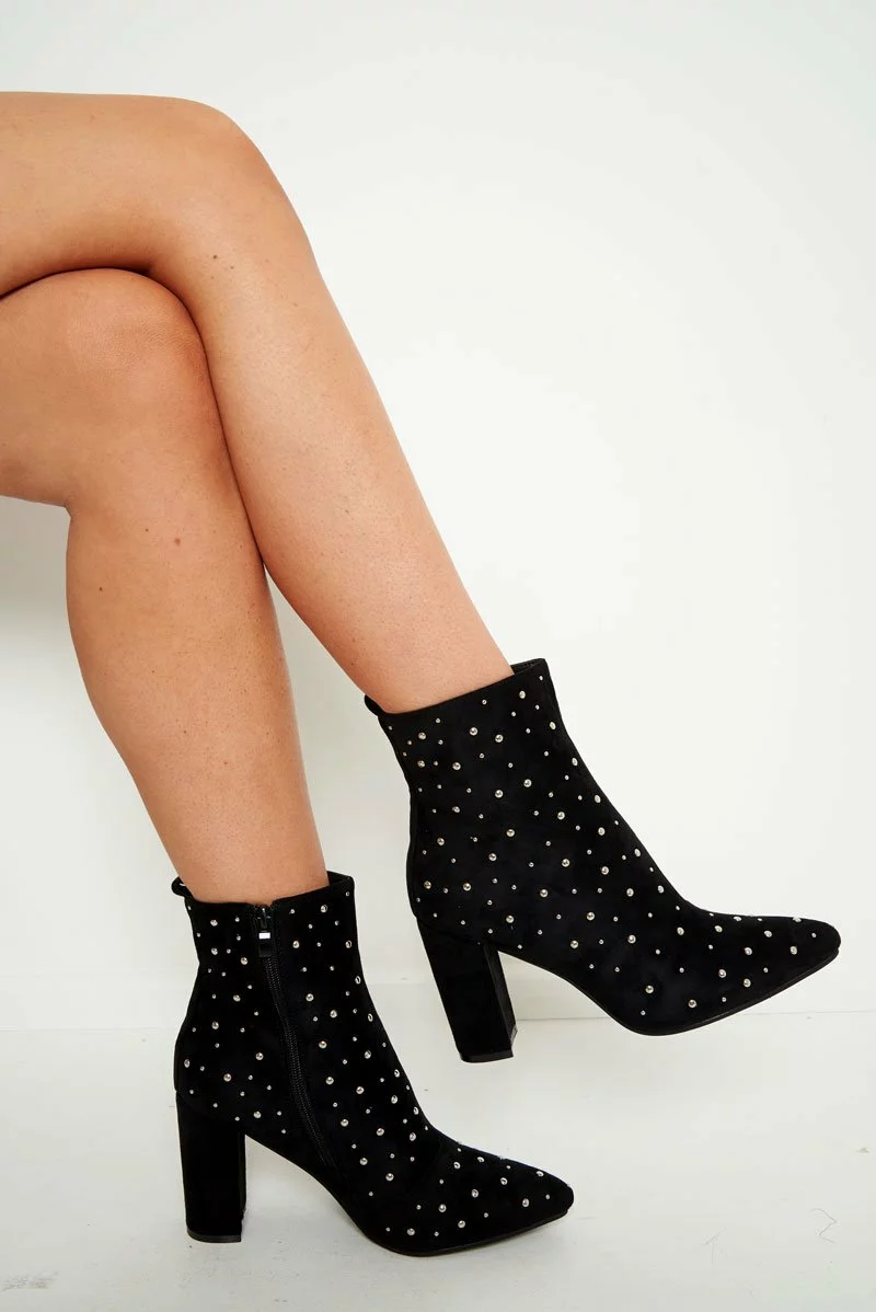 Strut your stuff in the Laelynn Black Faux Suede Studded Ankle Boots, complete with silver studding detail, zip side and block heel. Pair with jeans and a biker jacket for edgy vibes.