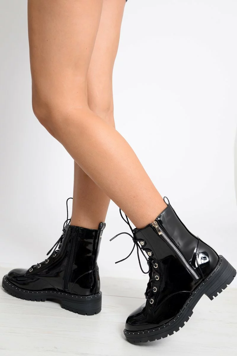 How Lust Worthy Are The Shiri Black Patent Lace Up Zip Ankle Boots, Featuring Zip Fastening, Lace Up And Zip Details And Patent Design!