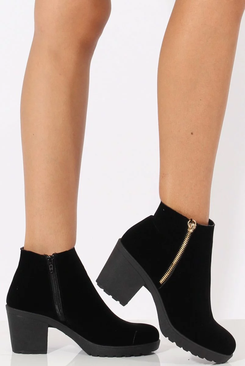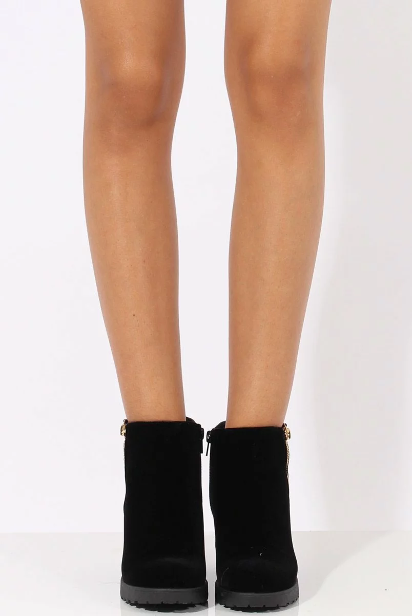 Kick it in style this Fall with our Casey Black Suede Zip Detail ankle Heeled Boots! Featuring a cleated sole and gold side zip which adds the perfect pop of colour, style your pair with wet look pants, oversized distressed tee and a bomber jacket for a smashing finish!