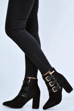 Go WILD for the Ekaterina Black Triple Buckle Detail Ankle Boots, complete with triple buckle detail, zip side and block heel. Pair with a cute smock dress and a bum bag for Coachella vibes.