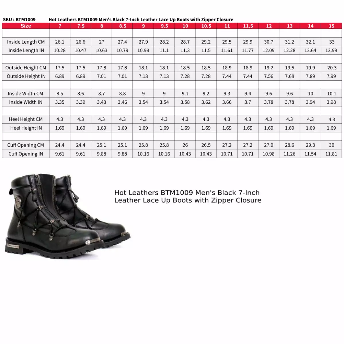 Hot Leathers BTM1009 Men’s Black 7-Inch Leather Lace Up Boots with Zipper Closure