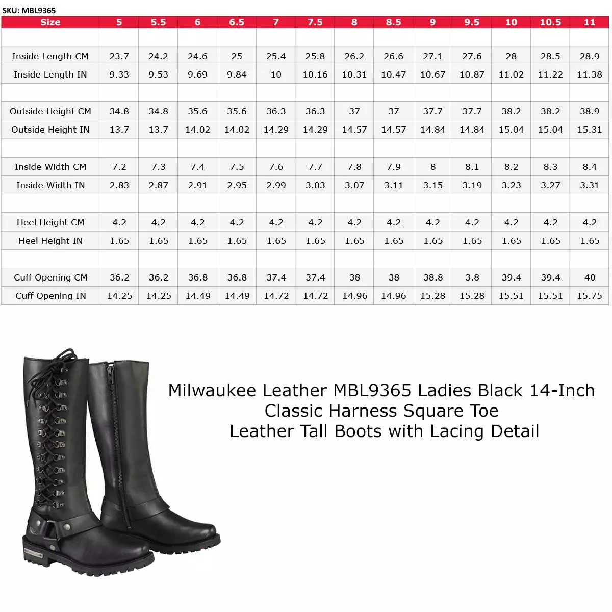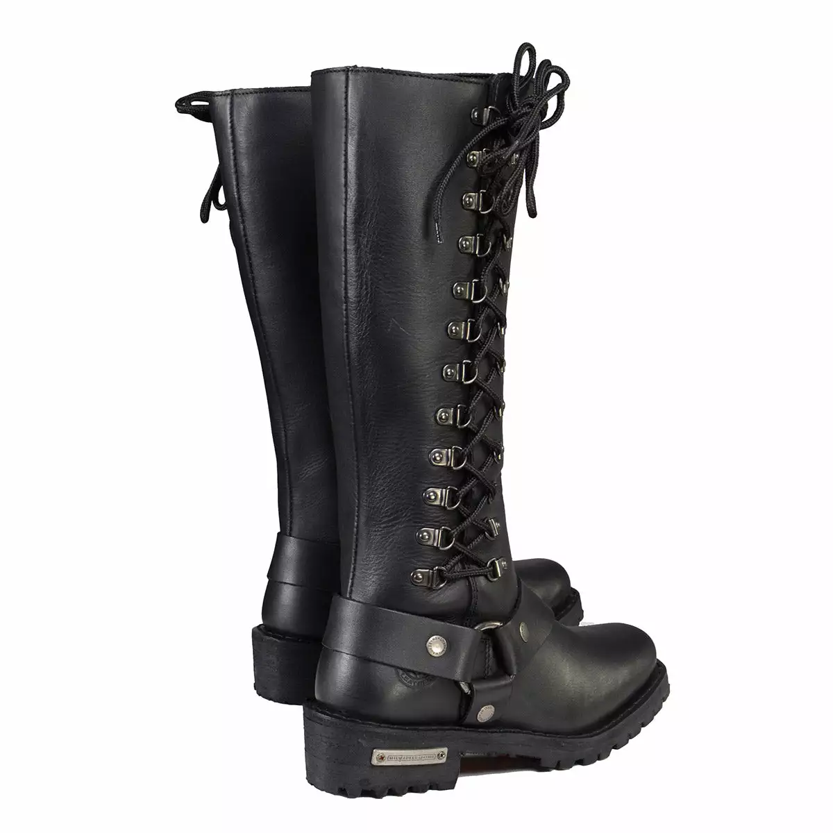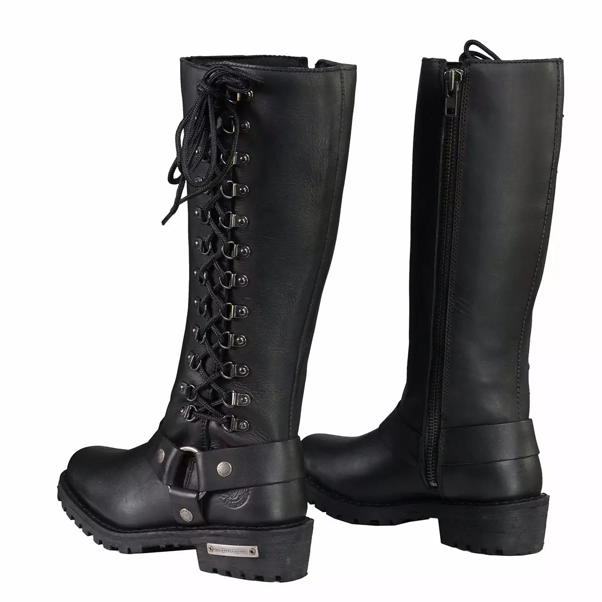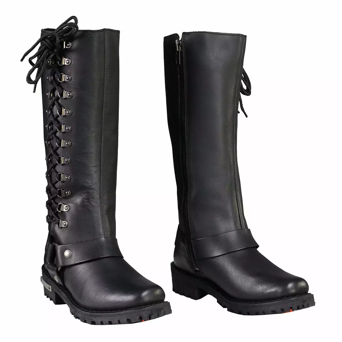 Milwaukee Leather MBL9365 Ladies Black 14-Inch Classic Harness Square Toe Leather Tall Boots with Lacing Detail