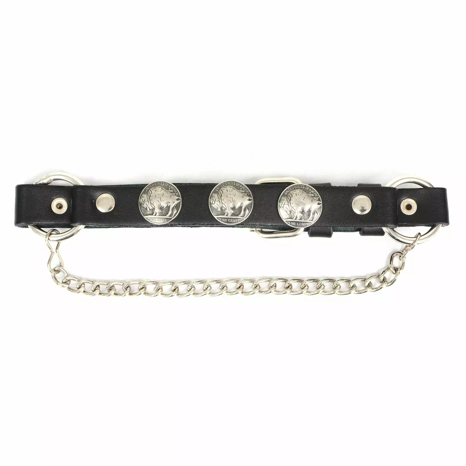 This Motorcycle Boot Chain Features 3 Vintage Buffalo 5 Cent Coin Medallions on An Adjustable Black Leather Strap and Silver Hardware. Silver Chain, Loops, Buckle and Rivets. Upgrade Your Favorite Pair of Boots with This One of A Kind Biker Accessory And Ride Out In Style! All boot chains are sold individually.