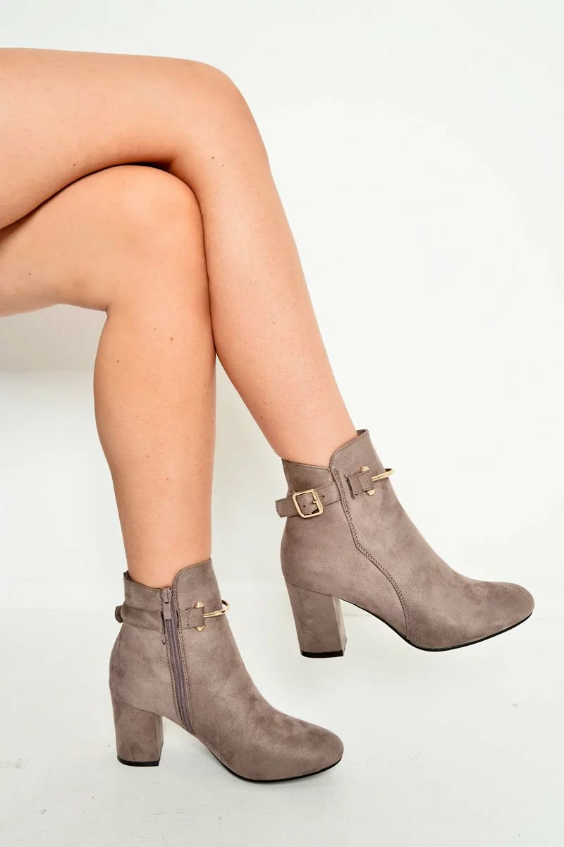 Look fierce in the Jynelle Mocha Faux Suede Gold Buckle Detail Ankle Boots, complete with faux suede material, gold buckle detailing and block heel. Pair with jeans and a blazer for the perfect off-duty look.