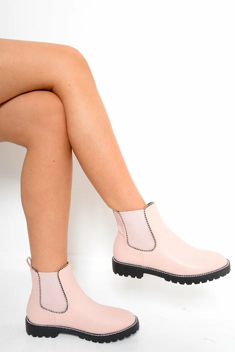 Get your hands on these Andie Pink PU Stud Detail Ankle Boots with cute AF stud detailing, PU upper, Chunky Sole and Pull on Tab!