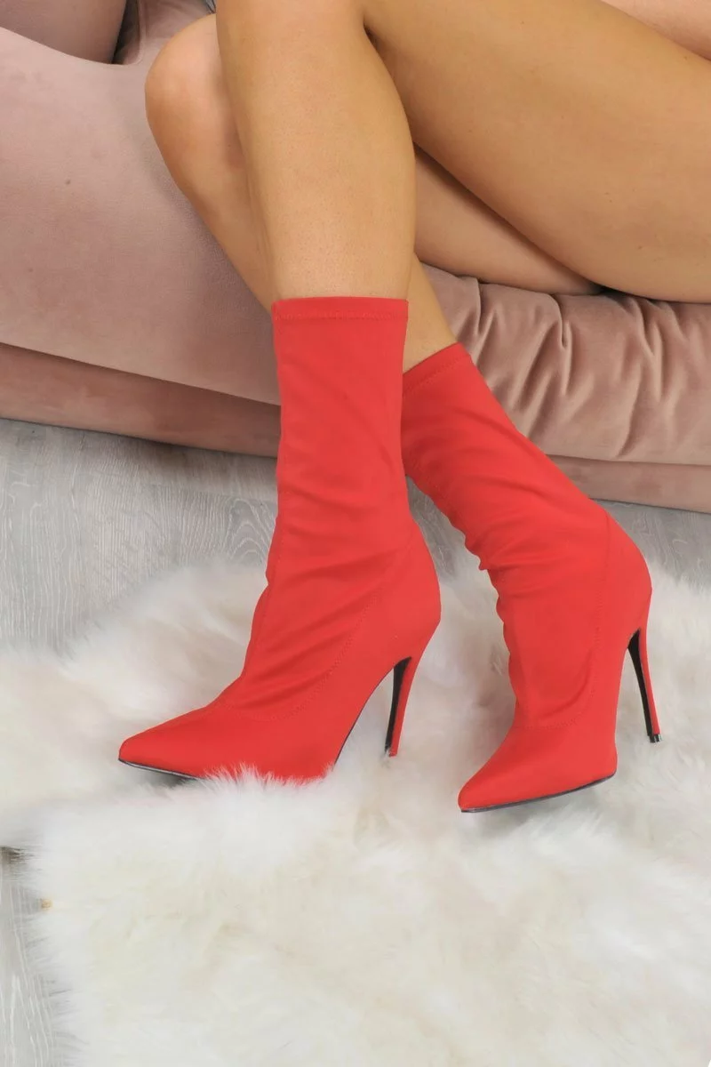 Your Shoe! Game will be STRONG girls in our! Aviya Red Lycra Stretch Heeled Ankle Boots. Featuring stretchy material with a heel and a pointy toe!