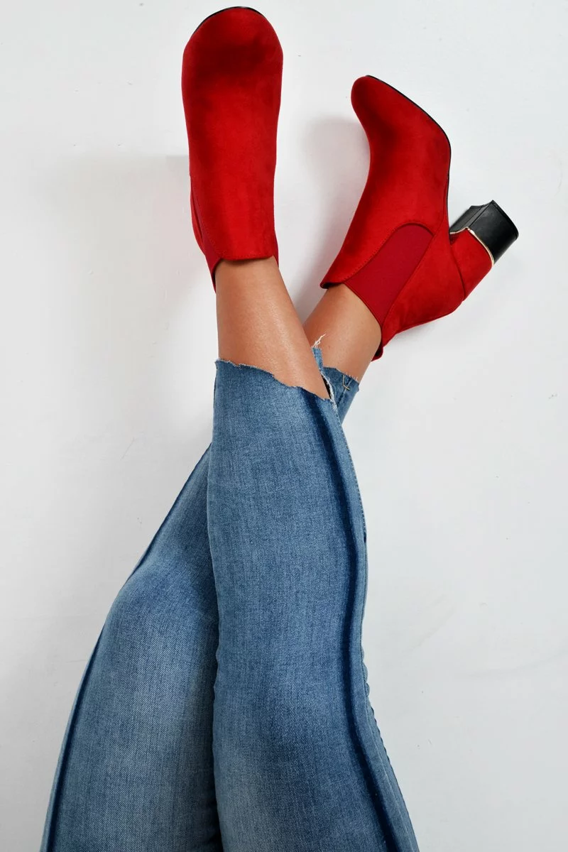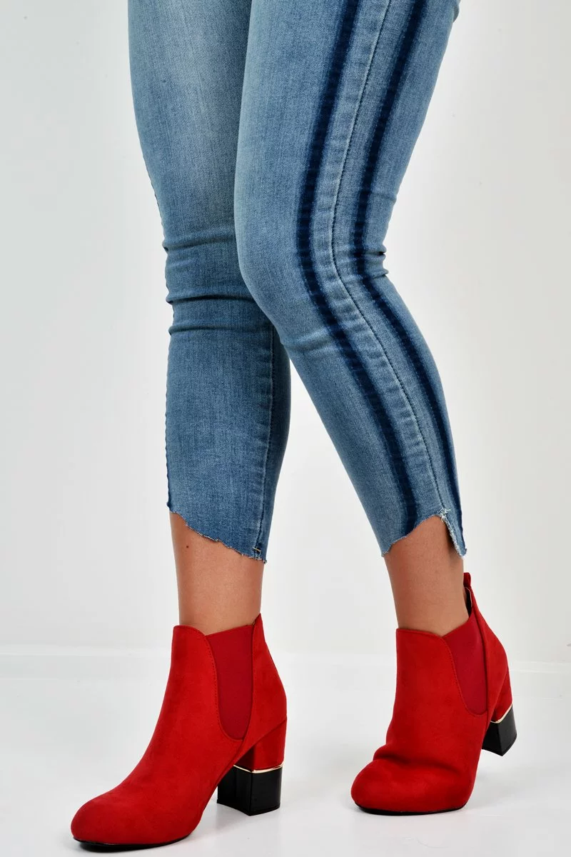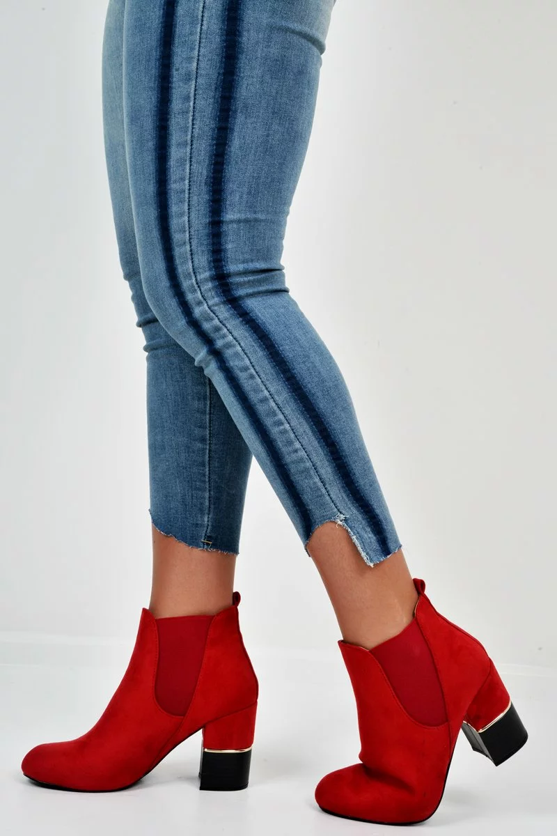 Stride into autumn with our Annison RedSuede Gold Detail Heeled Ankle Boots! Featuring gold trim detail and block heel!