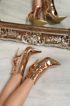 Strut your stuff in our Jorgia Rose Gold Chrome Heeled Ankle Boots featuring pointed front, killer heel, zipper at side and chrome finish!